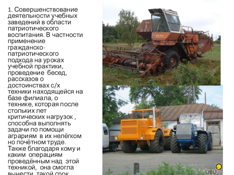 применение гражданско-патриотического подхода на уроках учебной практики, проведение бесед, рассказов о достоинствах с/х техники находящейся на базе филиала, о технике, которая после стольких лет критических нагрузок , способна выполнять задачи по помощи аграриям в их нелёгком но почётном труде. Также благодаря кому и каким операциям проведённым над этой техникой, она смогла вынести такой срок службы.