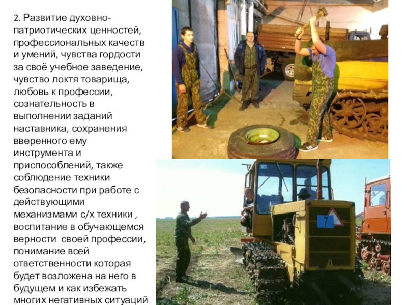 своё учебное заведение, чувство локтя товарища, любовь к профессии, сознательность в выполнении заданий наставника, сохранения вверенного ему инструмента и приспособлений, также соблюдение техники безопасности при работе с действующими механизмами с/х техники ,воспитание в обучающемся верности своей профессии,понимание всей ответственности которая будет возложена на него в будущем и как избежать многих негативных ситуаций с которыми ему придётся столкнуться в дальнейшем.