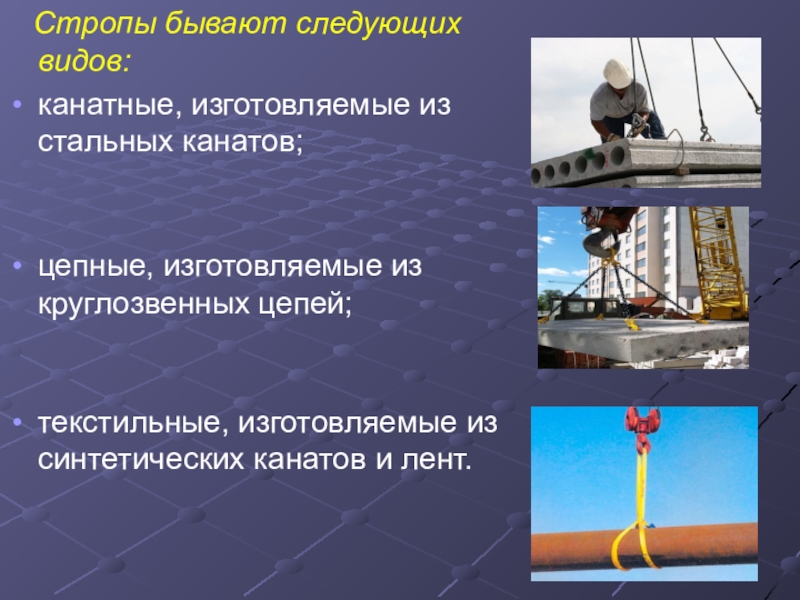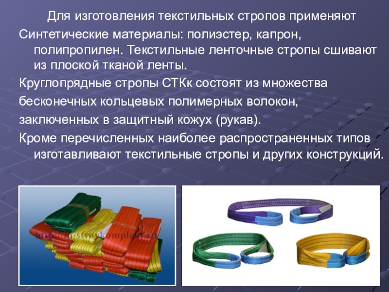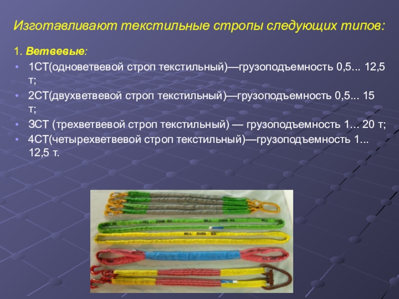 Слайд 15Изготавливают текстильные стропы следующих типов: