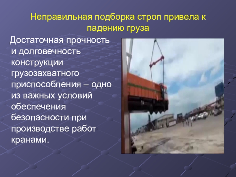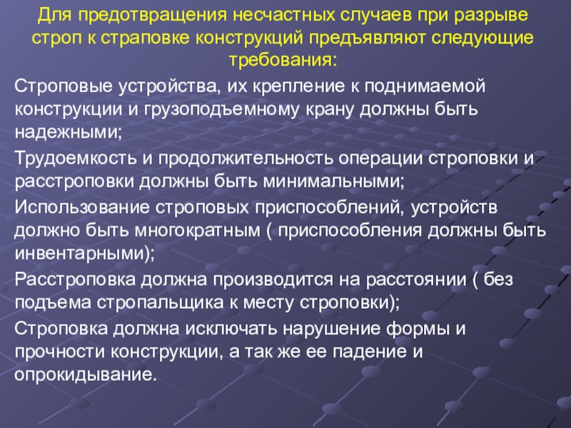 Слайд 22Для предотвращения несчастных случаев при разрыве строп к страповке конструкций предъявляют