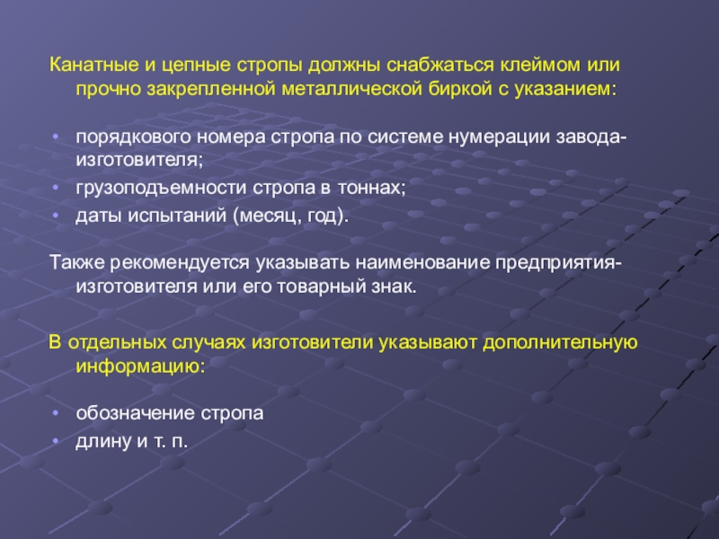 Слайд 9Канатные и цепные стропы должны снабжаться клеймом или прочно закрепленной металлической