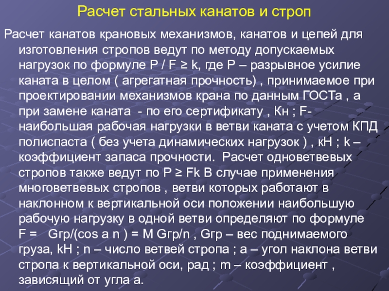 цепей для изготовления стропов ведут по методу допускаемых нагрузок по формуле P / F ≥ k, где P – разрывное усилие каната в целом ( агрегатная прочность) , принимаемое при проектировании механизмов крана по данным ГОСТа , а при замене каната - по его сертификату , Кн ; F- наибольшая рабочая нагрузки в ветви каната с учетом КПД полиспаста ( без учета динамических нагрузок ) , кН ; k – коэффициент запаса прочности. Расчет одноветвевых стропов также ведут по P ≥ Fk В случае применения многоветвевых стропов , ветви которых работают в наклонном к вертикальной оси положении наибольшую рабочую нагрузку в одной ветви определяют по формуле F = Gгр/(сos a n ) = M Gгр/n , Gгр – вес поднимаемого груза, kH ; n – число ветвей стропа ; a – угол наклона ветви стропа к вертикальной оси, рад ; m – коэффициент , зависящий от угла a.