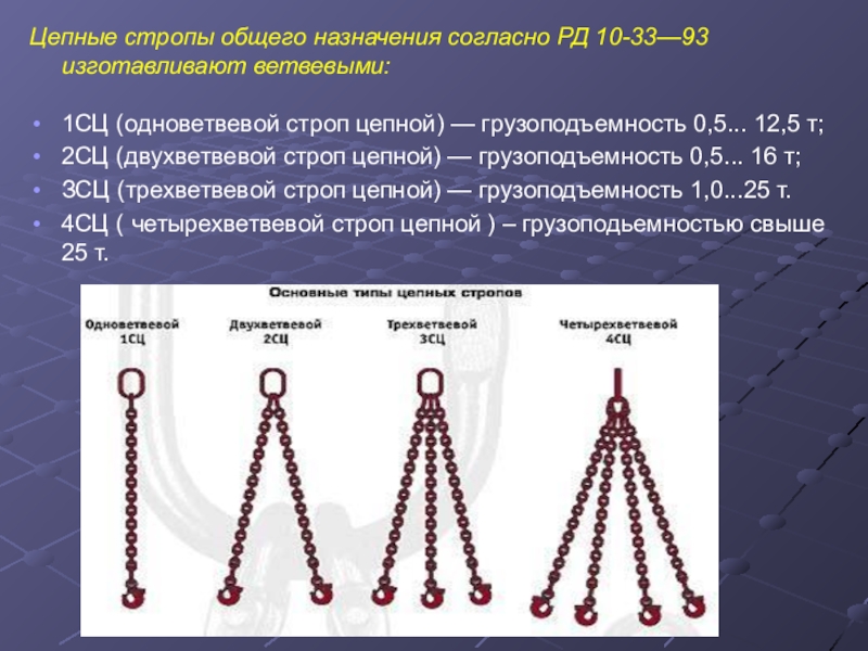 Слайд 12Цепные стропы общего назначения согласно РД 10-33—93 изготавливают ветвевыми: