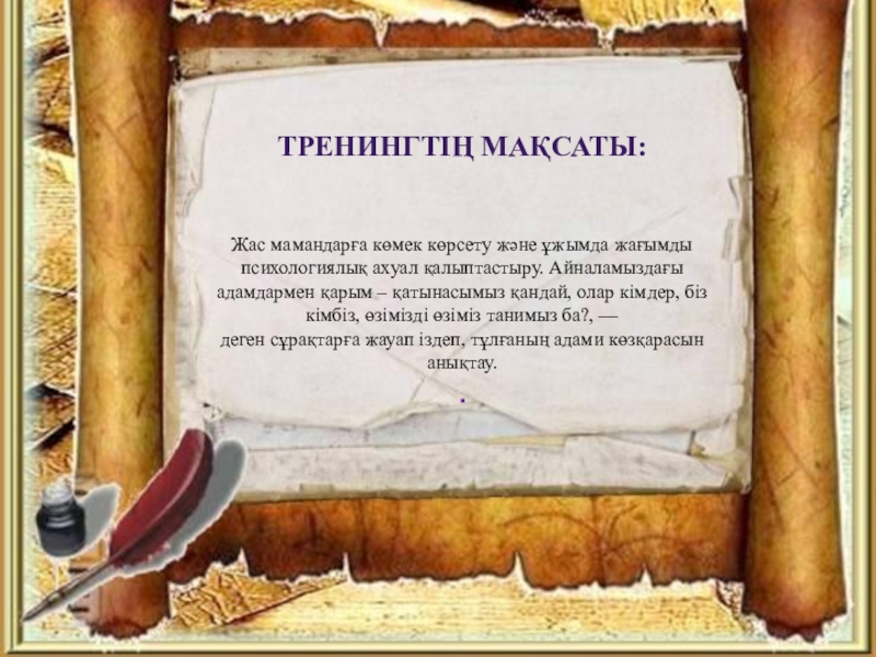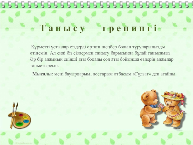 Құрметті ұстаздар сіздерді ортаға шеңбер болып тұруларыңызды өтінемін. Ал енді біз сіздермен танысу барысында бұлай танысамыз. Әр бір адамның екінші аты болады сол аты бойынша өздерін адамдар таныстырсын.