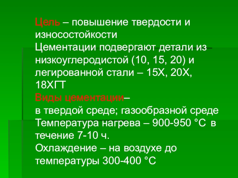 Цель – повышение твердости и износостойкостиЦементации подвергают детали из низкоуглеродистой (10, 15, 20) и легированной стали –