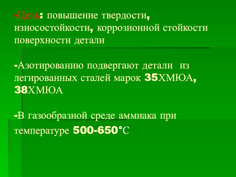 -Цель: повышение твердости, износостойкости, коррозионной стойкости поверхности детали  -Азотированию подвергают детали из легированных сталей марок 35ХМЮА,