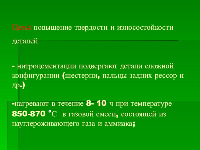 Слайд 9 Цель: повышение твердости и износостойкости деталей - нитроцементации подвергают детали сложной