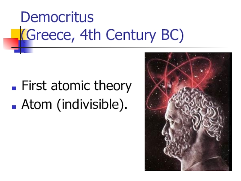 Democritus  (Greece, 4th Century BC)First atomic theoryAtom (indivisible).