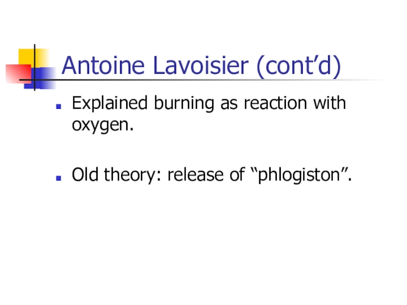 Explained burning as reaction with oxygen.Old theory: release of “phlogiston”. Antoine Lavoisier (cont’d)