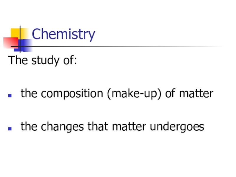 ChemistryThe study of: the composition (make-up) of matter the changes that matter undergoes