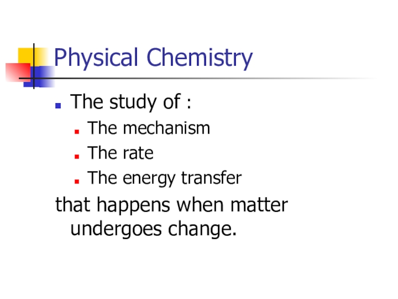 Physical ChemistryThe study of :The mechanismThe rateThe energy transferthat happens when matter undergoes change.