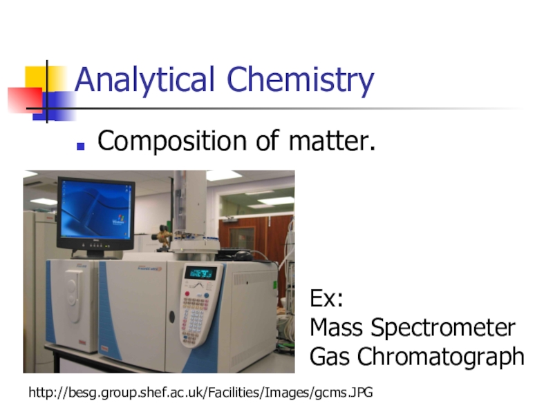 Analytical ChemistryComposition of matter.http://besg.group.shef.ac.uk/Facilities/Images/gcms.JPGEx: Mass Spectrometer Gas Chromatograph