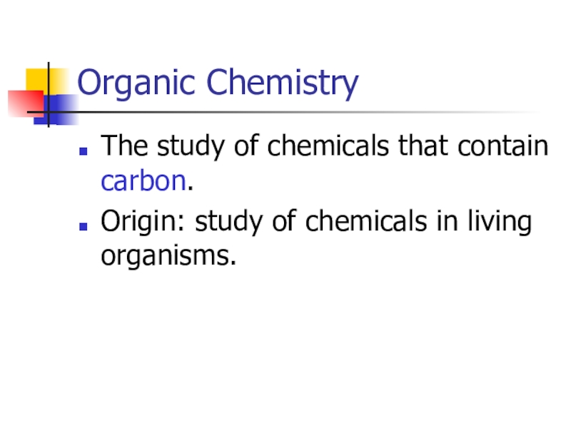 Organic ChemistryThe study of chemicals that contain carbon.Origin: study of chemicals in living organisms.