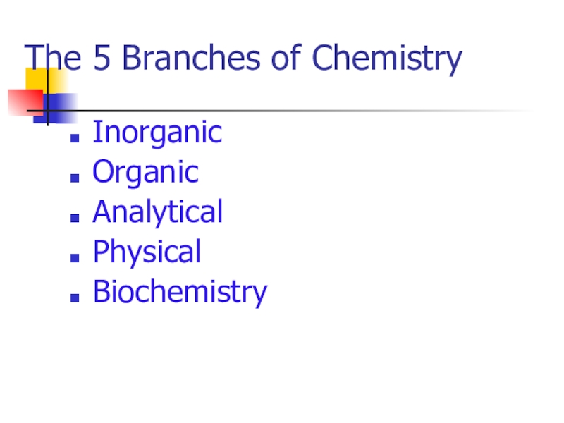 The 5 Branches of Chemistry Inorganic OrganicAnalyticalPhysicalBiochemistry
