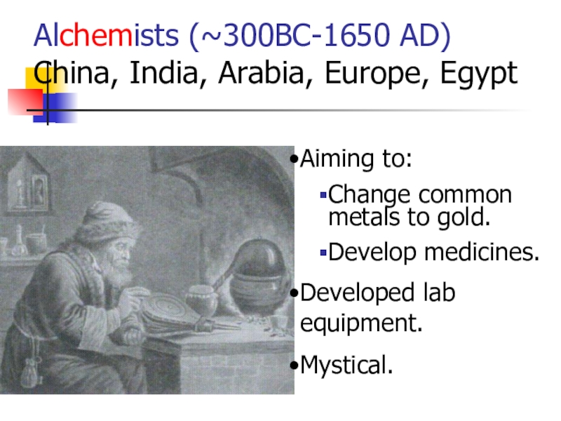 Alchemists (~300BC-1650 AD) China, India, Arabia, Europe, Egypt Aiming to:Change common metals to gold.Develop medicines.Developed lab equipment.Mystical.