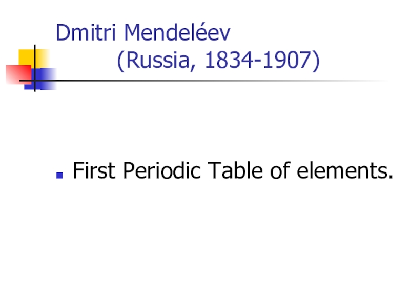 Dmitri Mendeléev  			(Russia, 1834-1907)First Periodic Table of elements.