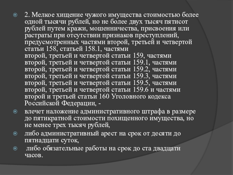 1. Мелкое хищение чужого имущества, стоимость которого не превышает одну тысячу рублей, путем кражи, мошенничества, присвоения или растраты