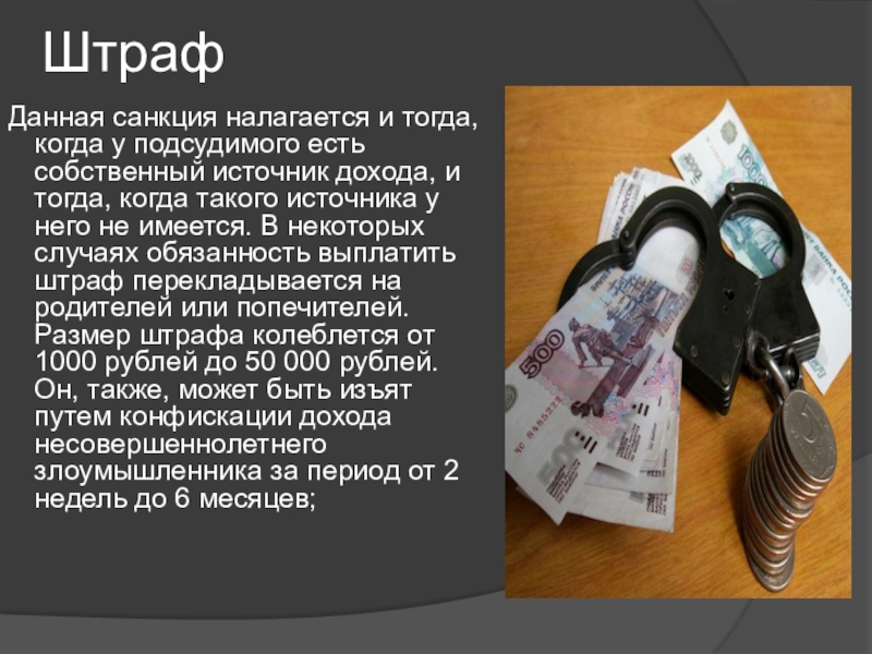 дохода, и тогда, когда такого источника у него не имеется. В некоторых случаях обязанность выплатить штраф перекладывается на родителей или попечителей. Размер штрафа колеблется от 1000 рублей до 50 000 рублей. Он, также, может быть изъят путем конфискации дохода несовершеннолетнего злоумышленника за период от 2 недель до 6 месяцев;