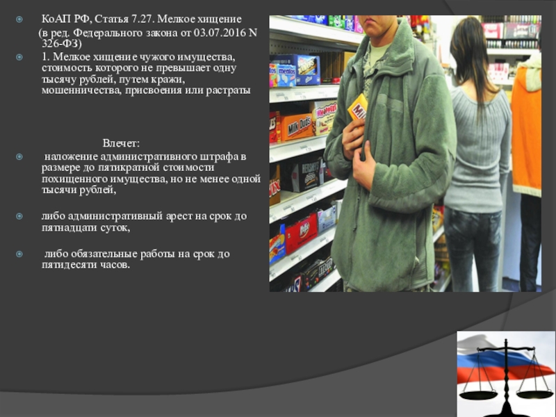 Слайд 4КоАП РФ, Статья 7.27. Мелкое хищение