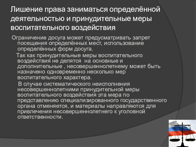 Слайд 15Лишение права заниматься определённой деятельностью и принудительные меры воспитательного воздействия