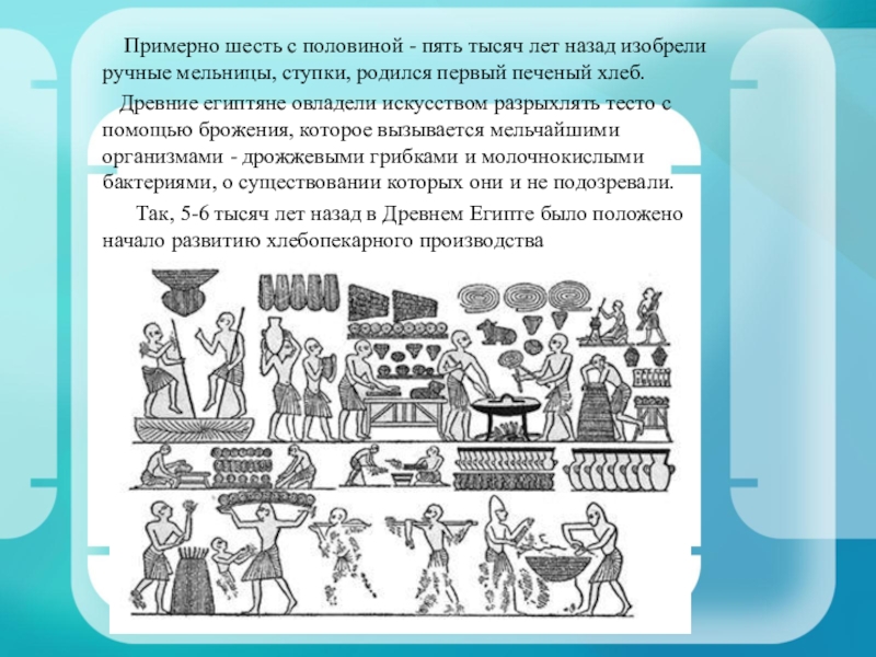 Так, 5-6 тысяч лет назад в Древнем Египте было положено начало развитию хлебопекарного производства