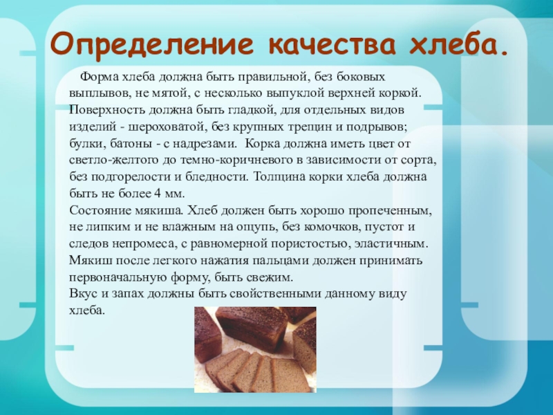 Состояние мякиша. Хлеб должен быть хорошо пропеченным, не липким и не влажным на ощупь, без комочков, пустот и следов непромеса, с равномерной пористостью, эластичным. Мякиш после легкого нажатия пальцами должен принимать первоначальную форму, быть свежим.