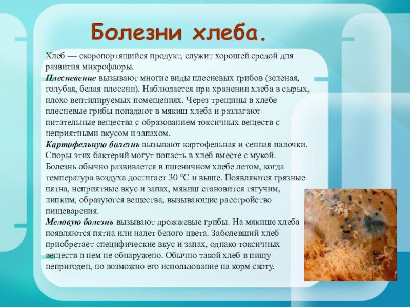 Плесневение вызывают многие виды плесневых грибов (зеленая, голубая, белая плесени). Наблюдается при хранении хлеба в сырых, плохо вентилируемых помещениях. Через трещины в хлебе плесневые грибы попадают в мякиш хлеба и разлагают питательные вещества с образованием токсичных веществ с неприятными вкусом и запахом.