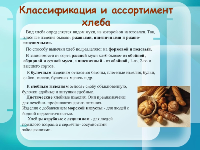 видом муки, из которой он изготовлен. Так, хлебные изделия бывают ржаными, пшеничными и ржано-пшеничными.