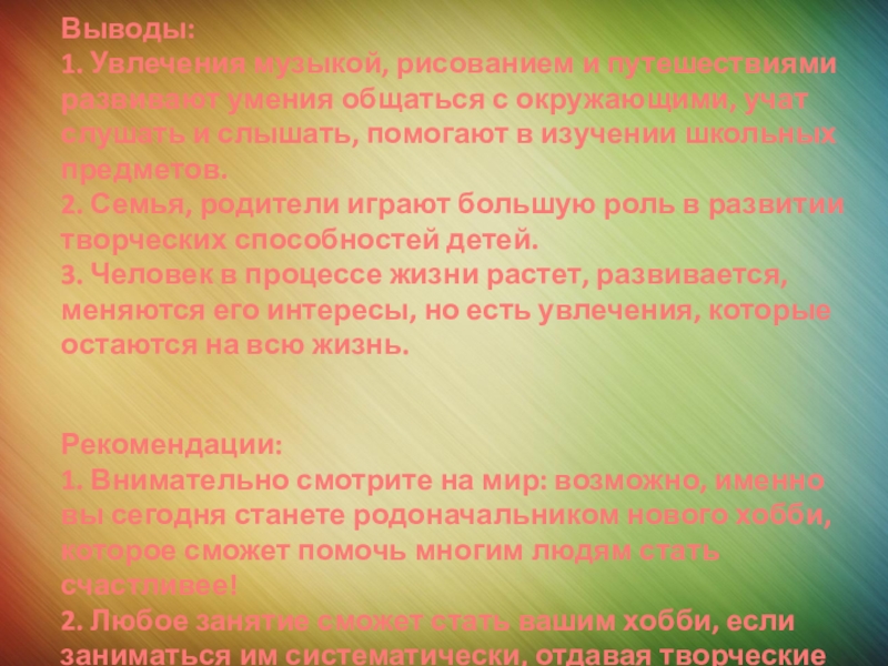 1. Увлечения музыкой, рисованием и путешествиями развивают умения общаться с окружающими,