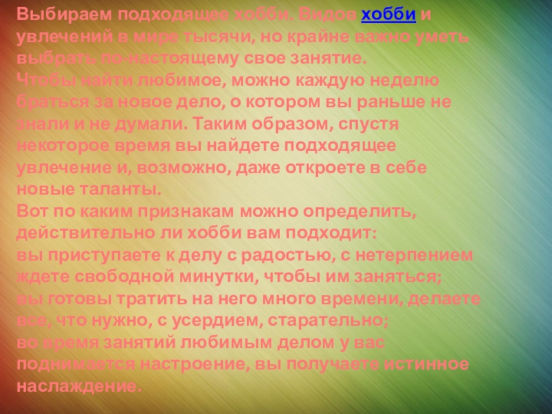 Слайд 10Выбираем подходящее хобби. Видов хобби и увлечений в мире тысячи, но крайне важно