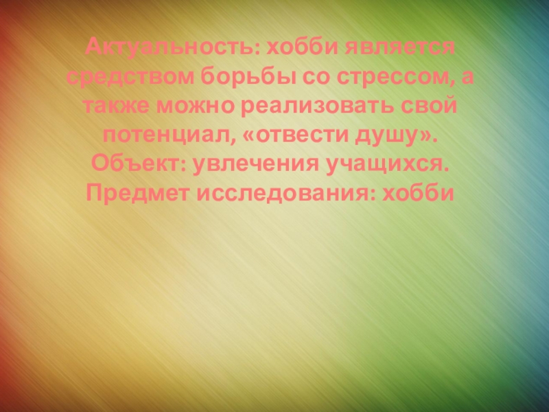 Слайд 6Актуальность: хобби является средством борьбы со стрессом, а также можно реализовать