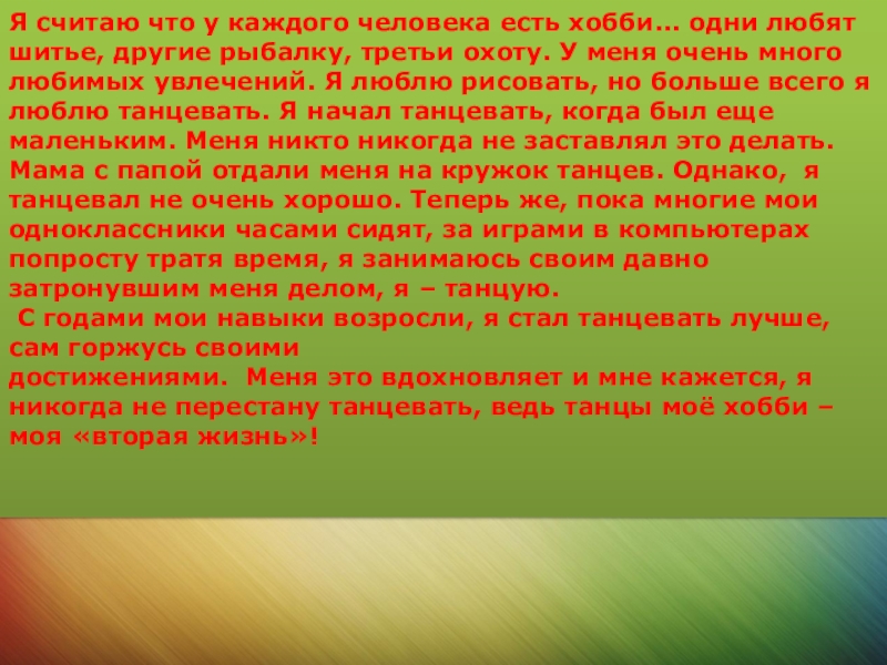 другие рыбалку, третьи охоту. У меня очень много любимых увлечений. Я люблю рисовать, но больше всего я люблю танцевать. Я начал танцевать, когда был еще маленьким. Меня никто никогда не заставлял это делать. Мама с папой отдали меня на кружок танцев. Однако, я танцевал не очень хорошо. Теперь же, пока многие мои одноклассники часами сидят, за играми в компьютерах попросту тратя время, я занимаюсь своим давно затронувшим меня делом, я – танцую.