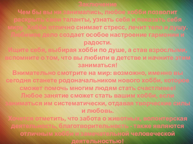 узнать себя и показать себя миру. Хобби отлично снимает стресс, лечит тело и душу. Любимое дело создает особое настроение гармонии и радости.