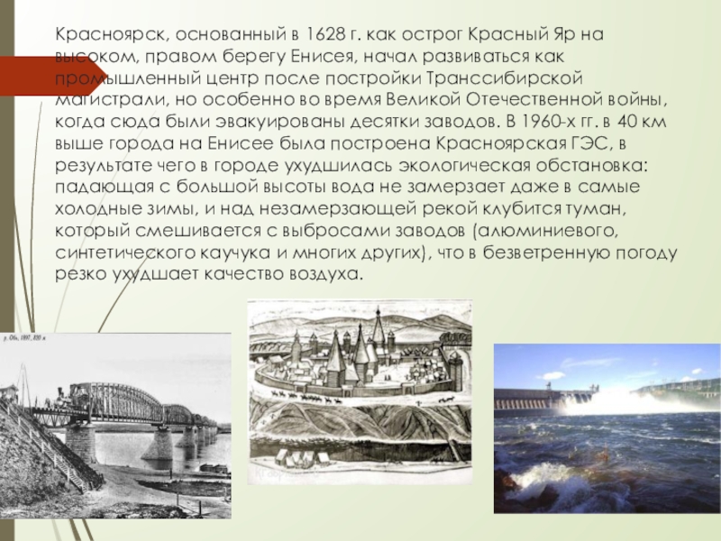 правом берегу Енисея, начал развиваться как промышленный центр после постройки Транссибирской магистрали, но особенно во время Великой Отечественной войны, когда сюда были эвакуированы десятки заводов. В 1960-х гг. в 40 км выше города на Енисее была построена Красноярская ГЭС, в результате чего в городе ухудшилась экологическая обстановка: падающая с большой высоты вода не замерзает даже в самые холодные зимы, и над незамерзающей рекой клубится туман, который смешивается с выбросами заводов (алюминиевого, синтетического каучука и многих других), что в безветренную погоду резко ухудшает качество воздуха.