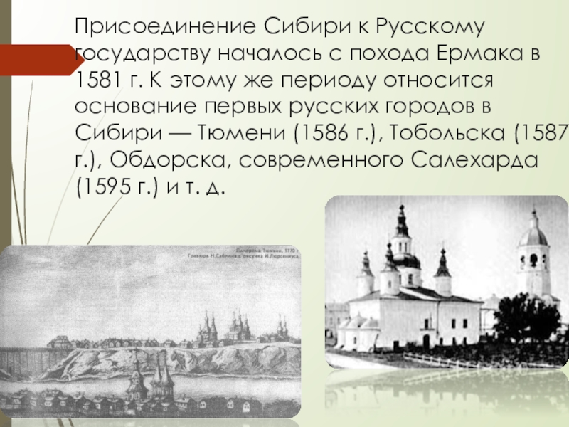 г. К этому же периоду относится основание первых русских городов в Сибири — Тюмени (1586 г.), Тобольска (1587 г.), Обдорска, современного Салехарда (1595 г.) и т. д.