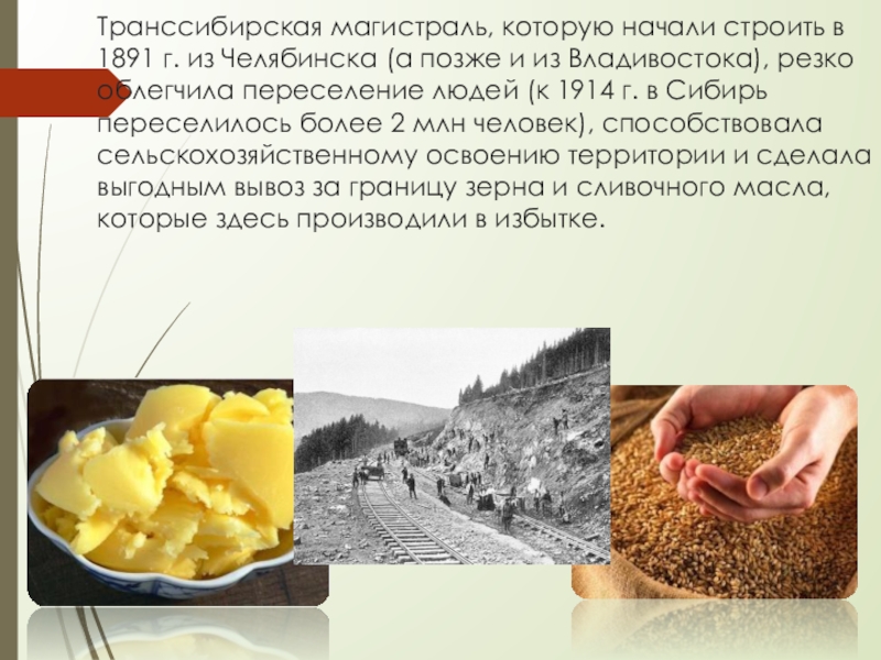 позже и из Владивостока), резко облегчила переселение людей (к 1914 г. в Сибирь переселилось более 2 млн человек), способствовала сельскохозяйственному освоению территории и сделала выгодным вывоз за границу зерна и сливочного масла, которые здесь производили в избытке.
