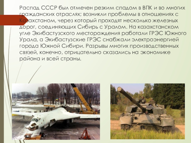 гражданских отраслях; возникли проблемы в отношениях с Казахстаном, через который проходят несколько железных дорог, соединяющих Сибирь с Уралом. На казахстанском угле Экибастузского месторождения работали ГРЭС Южного Урала, а Экибастузские ГРЭС снабжали электроэнергией города Южной Сибири. Разрывы многих производственных связей, конечно, отрицательно сказались на экономике района и всей страны.