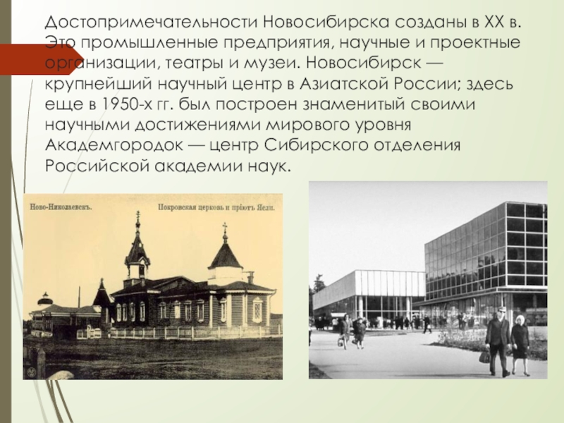 Слайд 10Достопримечательности Новосибирска созданы в XX в. Это промышленные предприятия, научные и