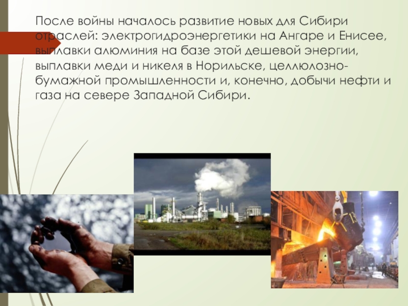 Слайд 12После войны началось развитие новых для Сибири отраслей: электрогидроэнергетики на Ангаре