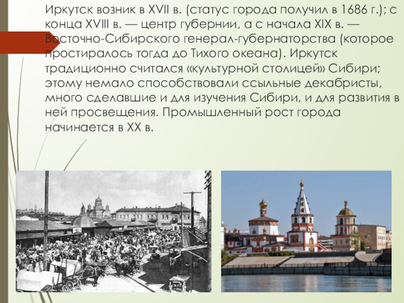 Слайд 8Иркутск возник в XVII в. (статус города получил в 1686 г.);