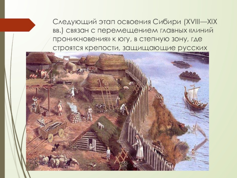 Слайд 6Следующий этап освоения Сибири (XVIII—XIX вв.) связан с перемещением главных «линий