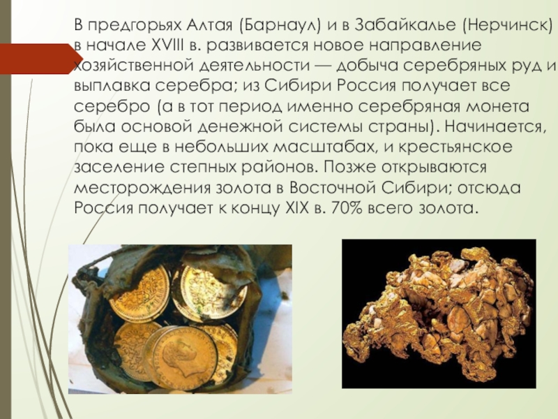 в. развивается новое направление хозяйственной деятельности — добыча серебряных руд и выплавка серебра; из Сибири Россия получает все серебро (а в тот период именно серебряная монета была основой денежной системы страны). Начинается, пока еще в небольших масштабах, и крестьянское заселение степных районов. Позже открываются месторождения золота в Восточной Сибири; отсюда Россия получает к концу XIX в. 70% всего золота.