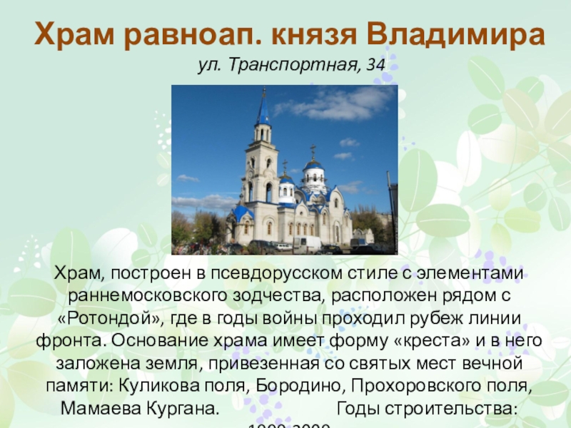 с элементами раннемосковского зодчества, расположен рядом с «Ротондой», где в годы войны проходил рубеж линии фронта. Основание храма имеет форму «креста» и в него заложена земля, привезенная со святых мест вечной памяти: Куликова поля, Бородино, Прохоровского поля, Мамаева Кургана. Годы строительства: 1999-2009