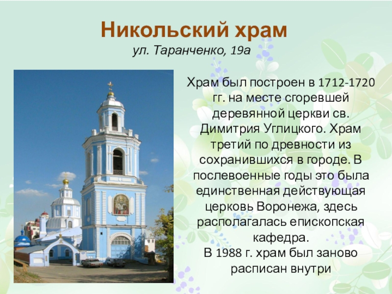 сгоревшей деревянной церкви св. Димитрия Углицкого. Храм третий по древности из сохранившихся в городе. В послевоенные годы это была единственная действующая церковь Воронежа, здесь располагалась епископская кафедра. В 1988 г. храм был заново расписан внутри
