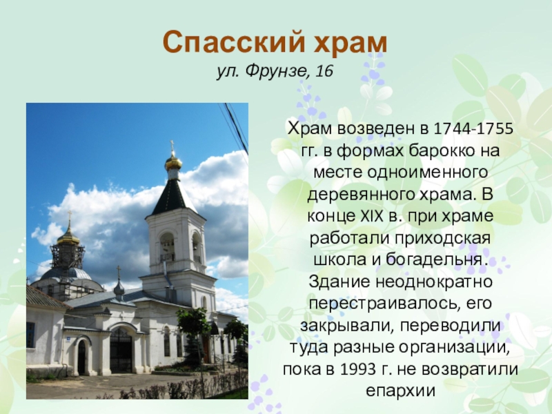 на месте одноименного деревянного храма. В конце XIX в. при храме работали приходская школа и богадельня. Здание неоднократно перестраивалось, его закрывали, переводили туда разные организации, пока в 1993 г. не возвратили епархии