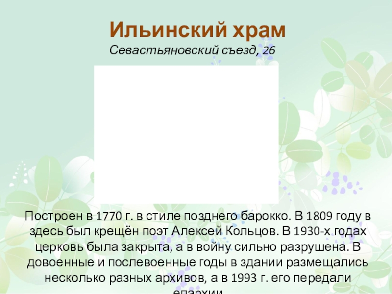 В 1809 году в здесь был крещён поэт Алексей Кольцов. В 1930-х годах церковь была закрыта, а в войну сильно разрушена. В довоенные и послевоенные годы в здании размещались несколько разных архивов, а в 1993 г. его передали епархии