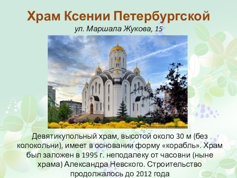 (без колокольни), имеет в основании форму «корабль». Храм был заложен в 1995 г. неподалеку от часовни (ныне храма) Александра Невского. Строительство продолжалось до 2012 года