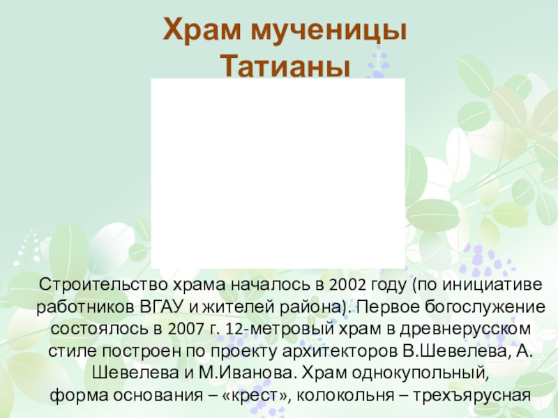 инициативе работников ВГАУ и жителей района). Первое богослужение состоялось в 2007 г. 12-метровый храм в древнерусском стиле построен по проекту архитекторов В.Шевелева, А.Шевелева и М.Иванова. Храм однокупольный, форма основания – «крест», колокольня – трехъярусная