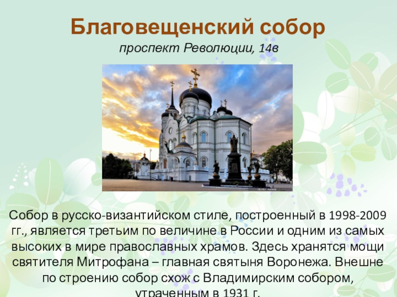 гг., является третьим по величине в России и одним из самых высоких в мире православных храмов. Здесь хранятся мощи святителя Митрофана – главная святыня Воронежа. Внешне по строению собор схож с Владимирским собором, утраченным в 1931 г.