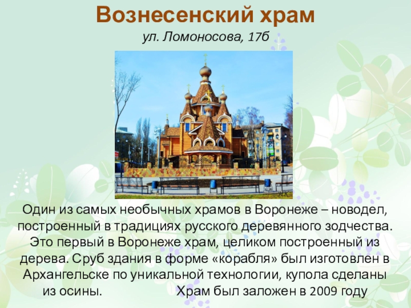 – новодел, построенный в традициях русского деревянного зодчества. Это первый в Воронеже храм, целиком построенный из дерева. Сруб здания в форме «корабля» был изготовлен в Архангельске по уникальной технологии, купола сделаны из осины. Храм был заложен в 2009 году